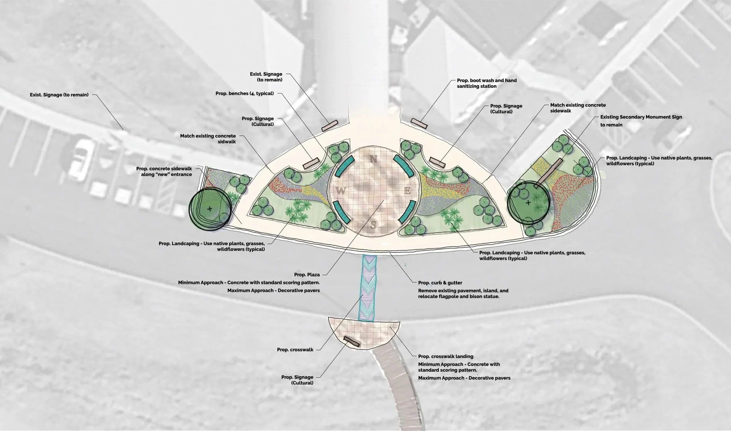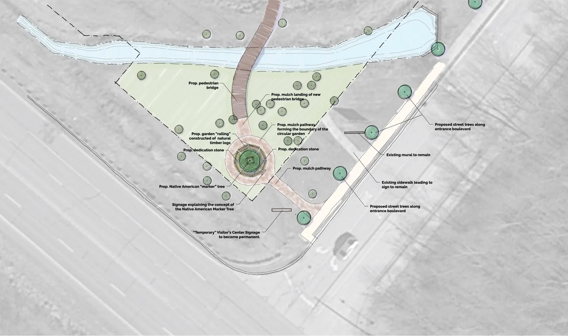 The project envisions a Culture Trail that begins on the Visitor Center grounds and serves as an educational and interpretive journey highlighting the stories, traditions, and lasting presence of local tribes. The master plan identifies key opportunities to create and enhance public spaces throughout the site including the repurposing of the rear lawn for community gatherings and demonstrations, the reconfiguration of the front building entrance to create a welcoming plaza and trailhead, and the design of a new front gateway that celebrates the cultural and natural landscape of the region.