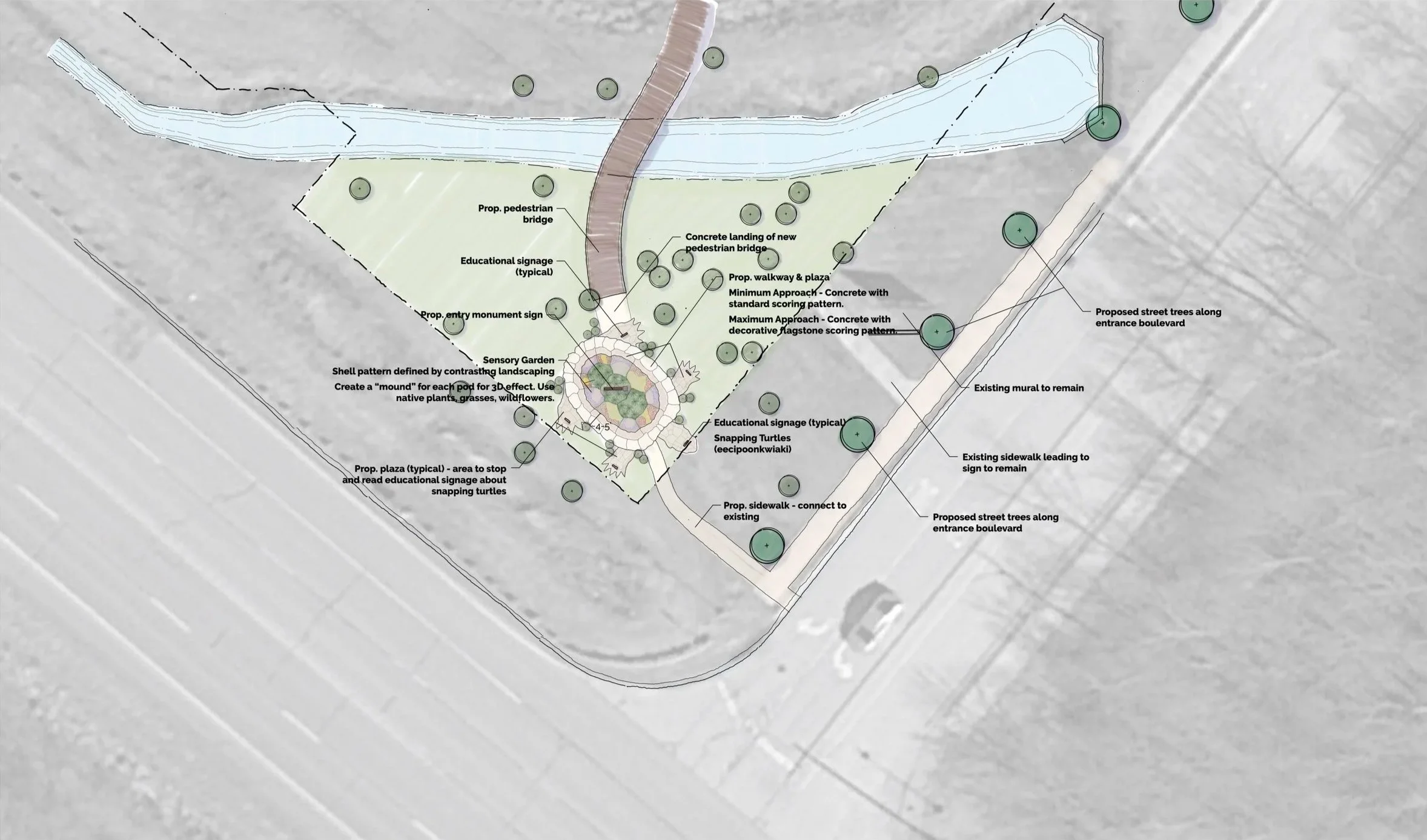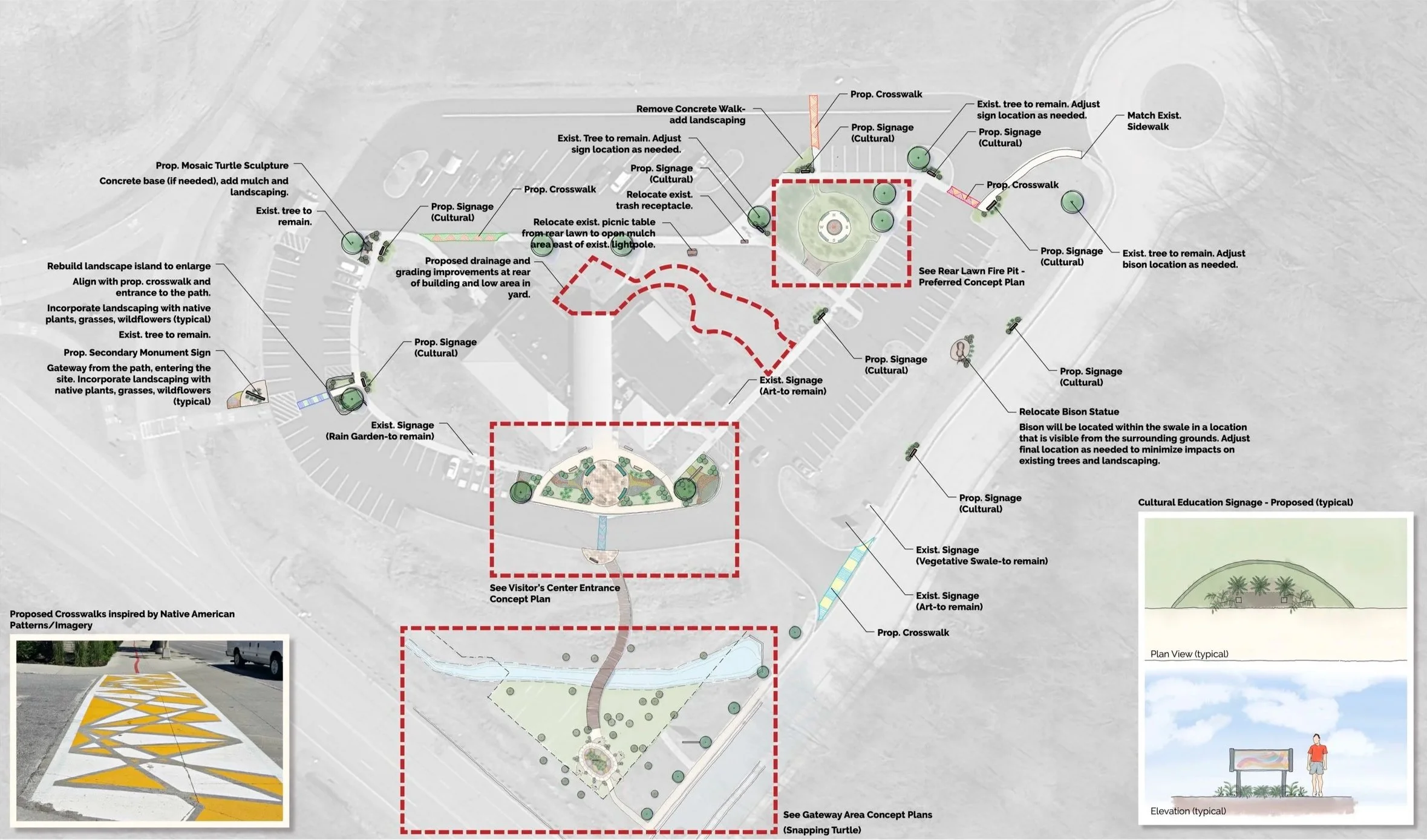 Proposed improvements include a circular gathering plaza with a central fire pit for cultural demonstrations, built-in seating, and flexible lawn areas for picnicking and events. The reimagined entrance features new signage, landscaping, and pedestrian-friendly spaces, while two options were developed for the front gateway, one featuring a sensory garden inspired by the snapping turtle, an animal of deep significance to both the Miami and Pokagon Tribes. Together, these elements create a cohesive and meaningful experience that honors Native heritage and connects visitors more deeply to the Indiana Dunes landscape.