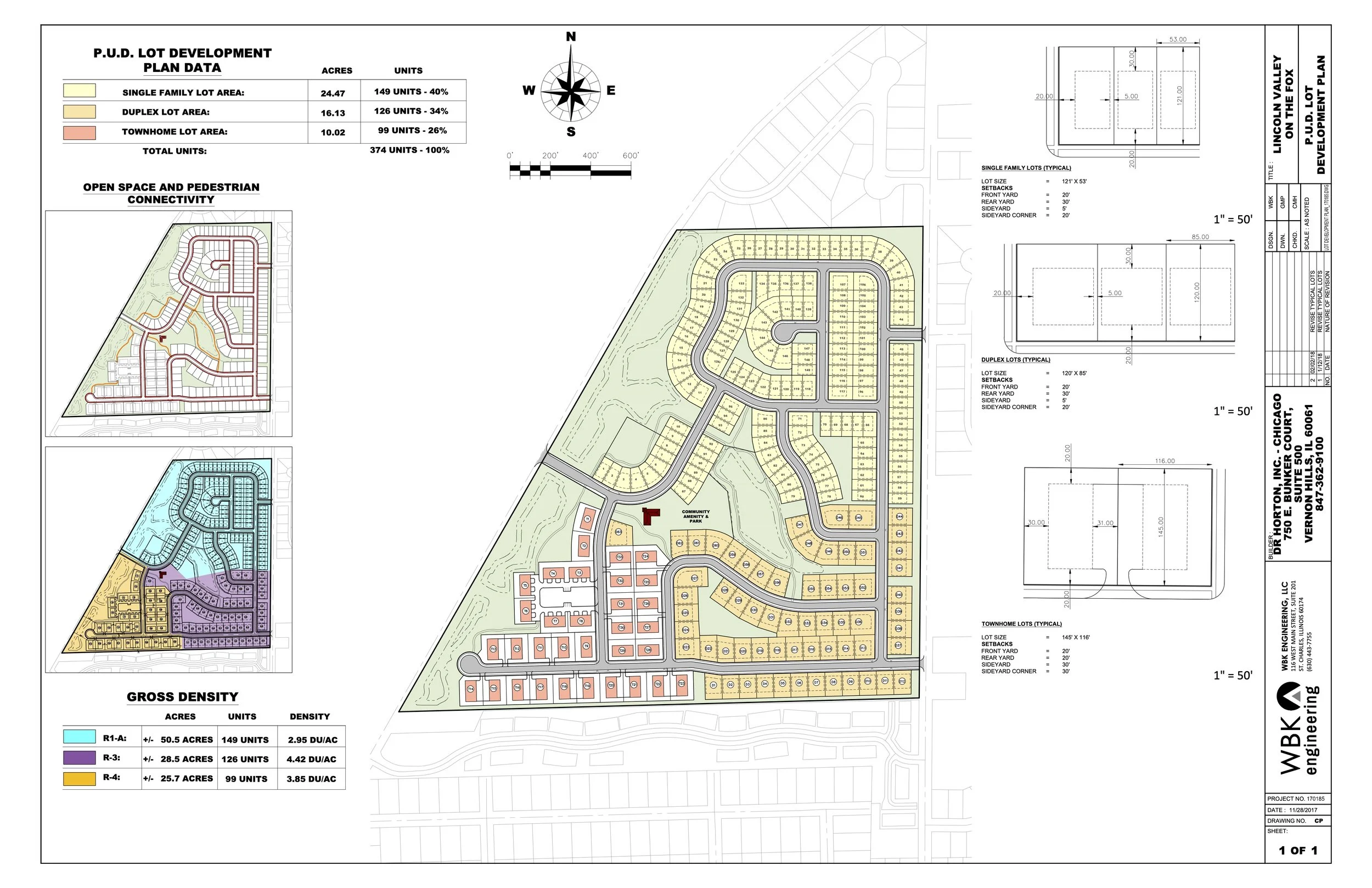 Senior Urban Planner for the design and entitlements of a 374-unit, age-targeted development in North Aurora, Illinois for one of the nation’s largest homebuilders. The 105 acre site was previously the home of a golf course featuring mature trees and rolling topography. Adam helped lead the design of the proposed land plan which preserved significant drainage corridors through the property with a design that created premium lots featuring views onto proposed storm water management along those corridors. The existing natural features and landscapes helped defined three distinct hamlets each with a mix of unit types including ranch-style, detached single-family, attached townhomes, and attached duplexes. An impressive entry boulevard with significant monument signage and landscaping forms a memorable neighborhood entry sequence that terminates on a community clubhouse with a backdrop overlooking stormwater detention and water features framed by mature oak trees. The project was constructed and completed in 2020.