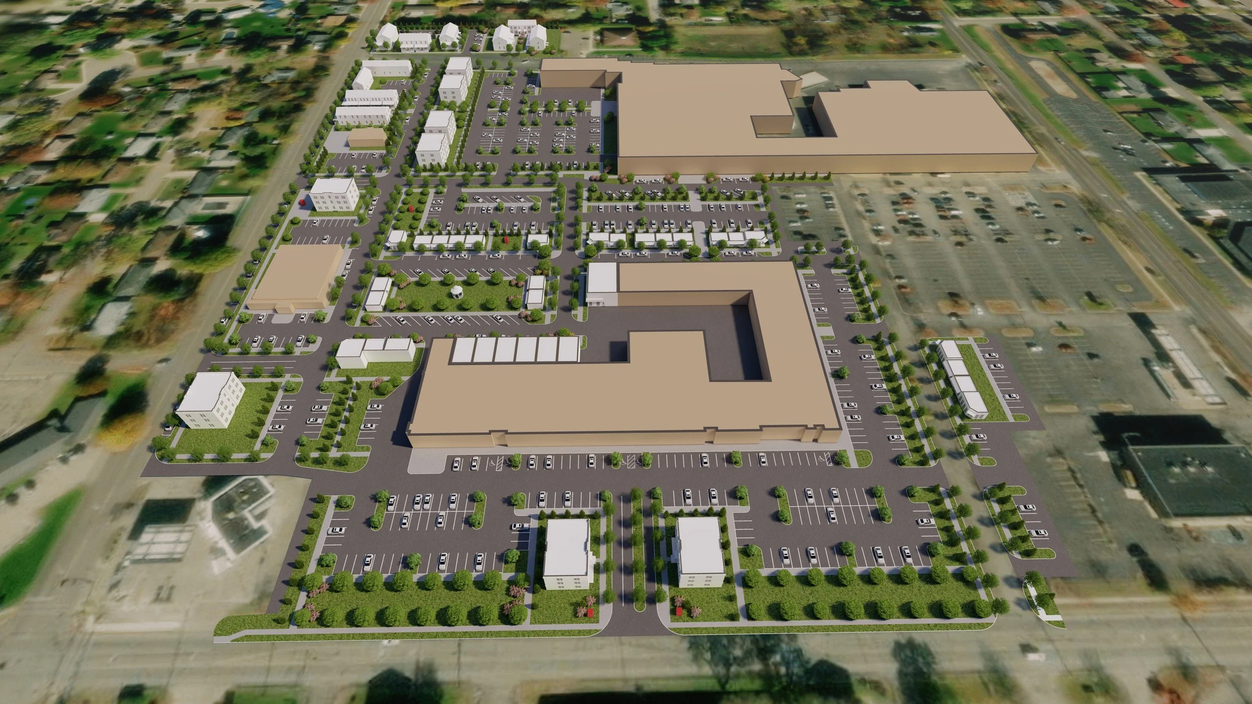 Woodland Crossing is a transformative redevelopment project that reimagines an aging commercial site into a vibrant, mixed-use district. The plan emphasizes reconnecting the surrounding neighborhoods by establishing a new street grid, pedestrian-friendly corridors, and a Village Green as a central gathering space. Phased improvements include façade and interior upgrades to existing buildings, construction of new for-sale residential units, reconfigured parking and circulation for major tenants like Goodwill and Heart City Health, and the introduction of new streetscapes and utility infrastructure to support future growth.